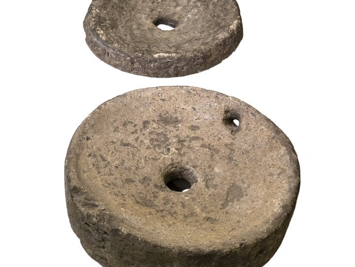 Romeinse maalstenen uit Haaksbergen. Deze twee maalstenen dateren uit de Romeinse tijd, tussen de 1e en 3e eeuw na Christus. Ze zijn in 1933 gevonden op 2,5 meter diepte in het Haaksbergerveen. De stenen zijn gemaakt van basaltlava, een hard gesteente dat geschikt is om graan te malen. De set bestaat uit een onderligger met één gat en een bovenligger met twee gaten. In het kleine gat zat een handvat. Door de bovenste steen rond te draaien, werd het graan tussen de stenen fijngemalen. Het meel kwam langs de rand naar buiten. Dit soort handmolens was onmisbaar in het dagelijks leven voor het maken van brood en pap.