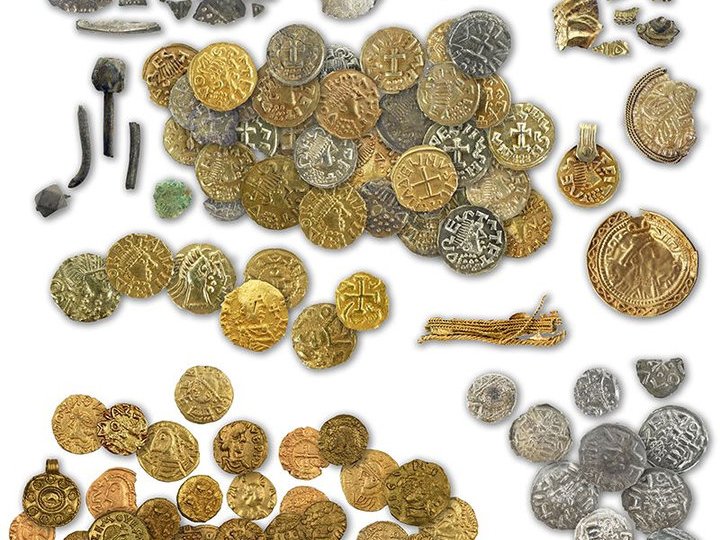 Muntschat van Hezingen. In het Springendal bij Hezingen is een bijzondere schat gevonden uit de 6de en 7de eeuw na Christus. De vondst bestaat uit ruim honderd gouden munten, enkele zilveren munten en sieraden. Ze dateren uit de Merovingische tijd, de vroege middeleeuwen. De voorwerpen lagen bij houten palen op een kruispunt van oude wegen. Op deze plek zijn gedurende ongeveer een eeuw waardevolle bezittingen achtergelaten. Daarom zien archeologen dit als een offerplaats. Het gaat niet om een verborgen geldvoorraad. De munten en sieraden zijn bewust gegeven als geschenk aan hogere machten. Deze goed onderzochte vindplaats is een van de belangrijkste vroegmiddeleeuwse ontdekkingen van Nederland.